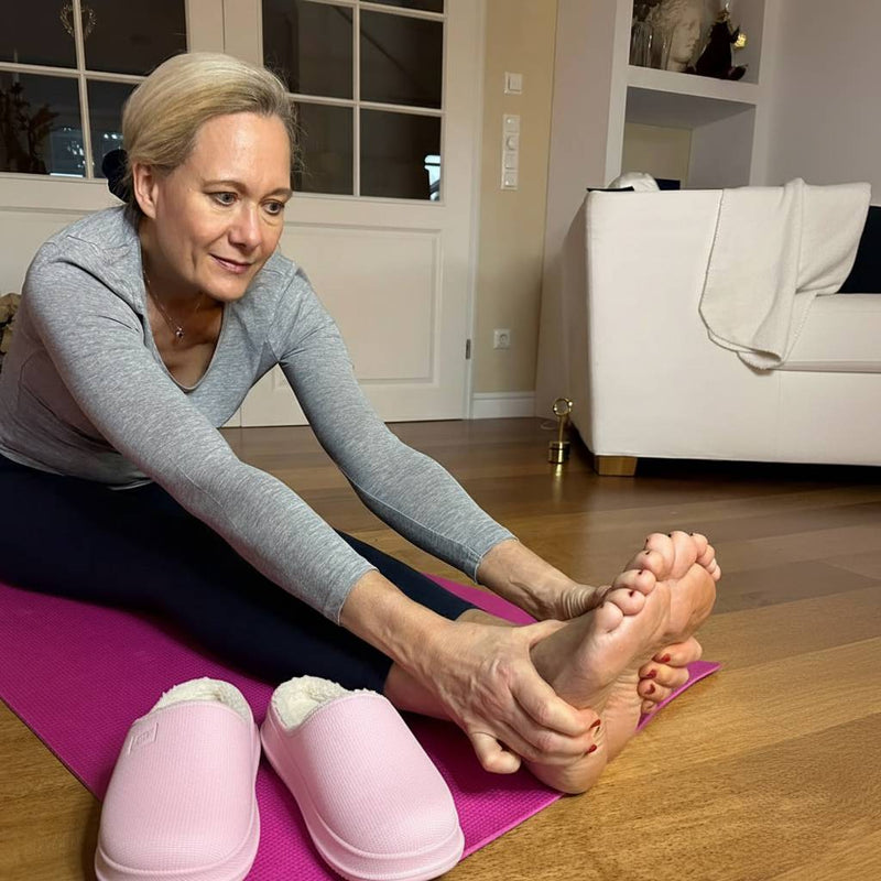 She highlights that indoor footwear is often overlooked, even though most people spend hours on hard floors at home.